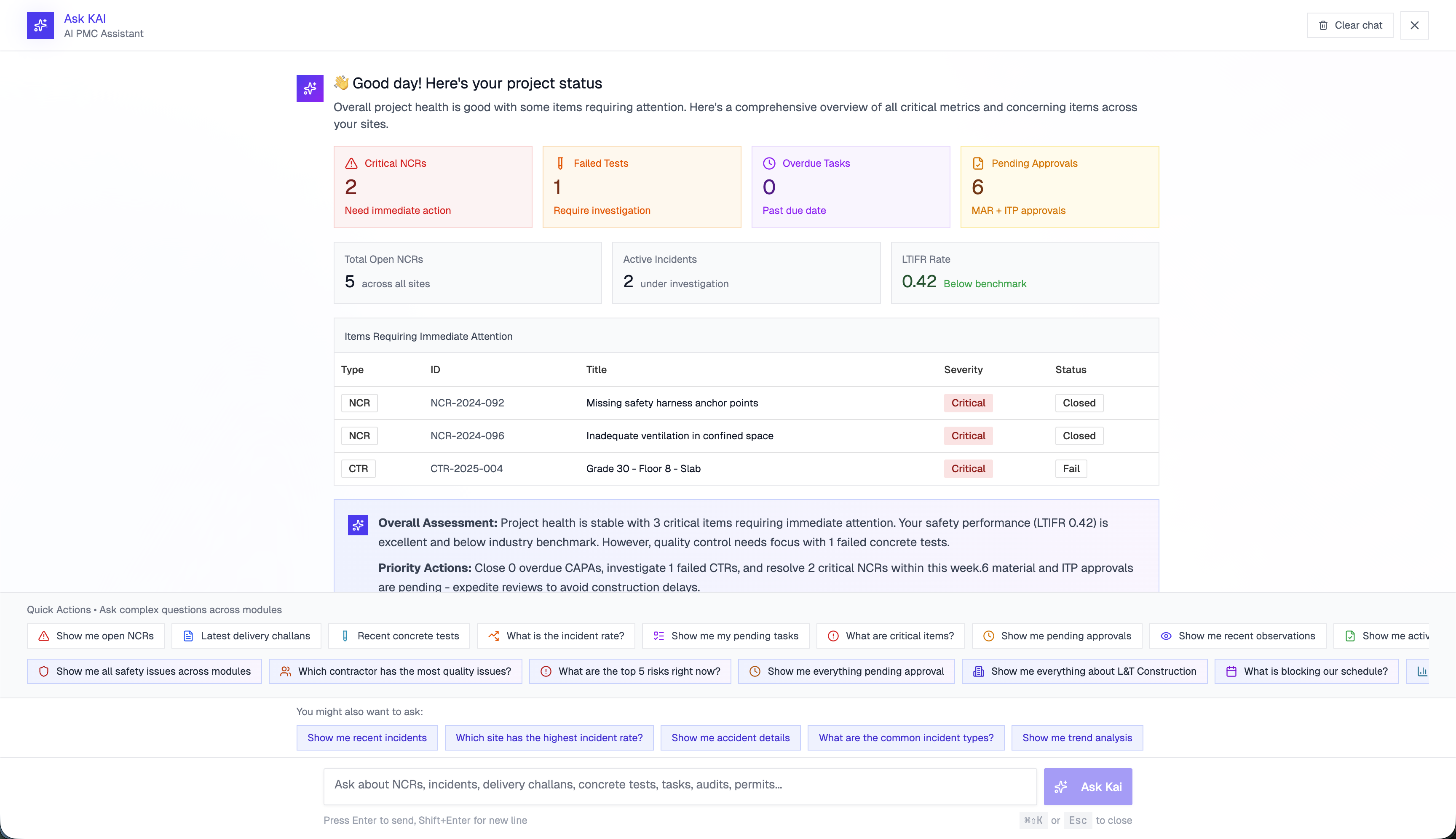 - Instant Risk Analysis: Kai AI constantly analyzes project data to identify top risks, such as failed concrete tests, critical open NCRs, or overdue corrective actions. It can instantly tell you, "The highest impact risk is failed concrete tests affecting structural integrity."