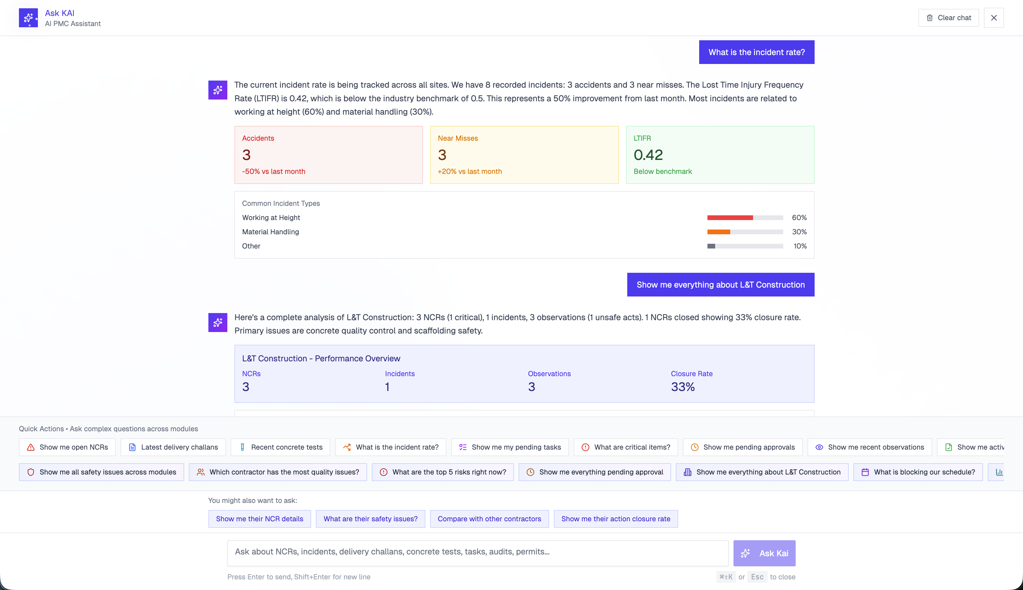 - Decision Support: Whether it's analyzing contractor performance or suggesting mitigation plans for identified risks, Kai AI provides the insights needed to make informed decisions quickly.