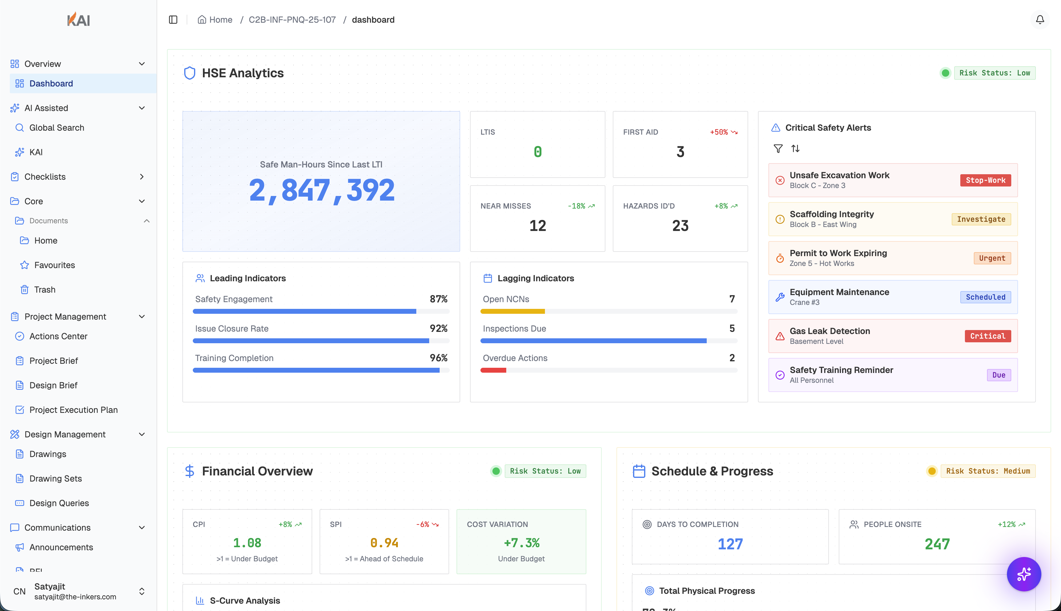- Proactive Alerts: Instead of waiting for you to find problems, Kai AI highlights critical approvals pending, expired permits, and safety trends that need attention.